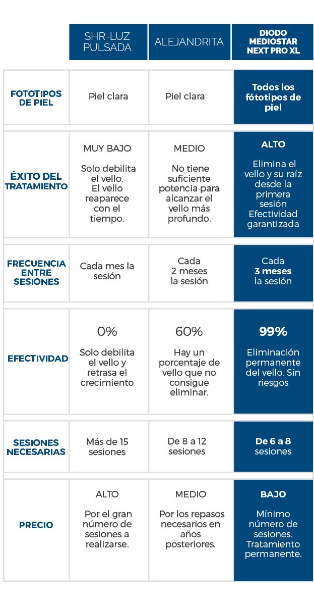 El más rápidoEl MedioStar NeXT PRO XL obtuvo la FDA Americana en Agosto del 2011 para el tratamiento de la depilación láser, acreditando la efectividad y seguridad de uso. Gracias a sus características técnicas que combinan energía, duración de pulso, sistema de enfriamiento y sobre todo un sistema dual de emisión (Sistema Basic y Smoothpulse) podemos avalar que es el mejor sistema para la depilación en todos los fototipos (incluso pieles bronceadas) y en cualquier época del año.